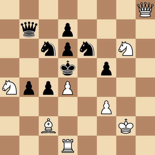 Po dowolnym odejściu 1… Se6 dow. mamy mat 2.Sf4X. Czarne ,,poprawiają” obronę tym skoczkiem grając 1… Se:d4!, ale wiążą swojego skoczka, co białe wykorzystują poprzez 2.Hg8X. Analogicznie 1… Sc6 dow. 2.Se7X. Po poprawionej obronie 1… Sc:d4! 2.H:b7X.